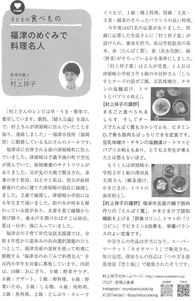 学校給食2月号 発売中です。 2026年1月22日By soratobu お知らせ 連載中の「子どもの食べもの」今月は 「福津のめぐみで料理名人」です。 投稿ナビゲーション pumpkin(パンプキン)2月号発売中です!2026年2月 村上祥子の料理教室in福岡 募集中です! コメントする コメントをキャンセルメールアドレスが公開されることはありません。 ※ が付いている欄は必須項目です